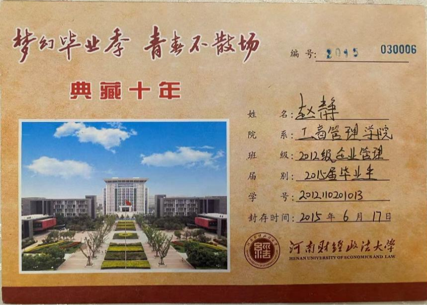 深秋的校园,金桂飘香,洋溢着收获的喜悦。10月11日,学院迎来了一位特殊的“家人”——工商管理学院2015届企业管理专业毕业生赵静重返母校。她此行的目的,是开启并领取一份毕业时封存的珍贵礼物——一封写于2015年6月17日的“致十年后自己”的亲笔信。一场跨越近三千个日夜的对话,让这场重逢充满了温馨与感慨。