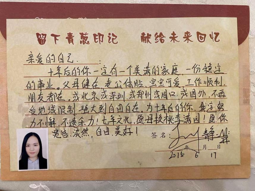 “亲爱的自己:十年后的你一定有一个美满的家庭,一份稳定的事业。父母健在,老公体贴,宝宝可爱,工作顺利,朋友都在……”信中的赵静,对未来的自己勾勒出了一幅幸福生活的蓝图。她还期望自己能“强大到自由自在”,并逐一列出了希望旅行的城市清单:深圳、成都、武汉、西安。信的结尾,她不忘祝福母校桃李满园,并希望自己“宽容、淡然,自由、美好”。卡片虽已微微泛黄,但字迹依然清晰,充满了青春的笔触与温度。赵静激动地分享到“看到这些文字,当年的情景瞬间就回来了。毕业时对前路有期待也有不安,把这些最朴素的愿望写下来,像是埋下了一颗时间的种子。”她坦言,工作生活的忙碌让她几乎忘记了这封信的具体内容,信中许下的诸多愿望,如今已实现大半。“稳定的事业”“美满的家庭”已从纸上的铅字,变成了她真切的生活。而当年希望“强大到自由自在”的期许,也在岁月的磨砺中,内化为了她从容应对挑战的底气与能力。