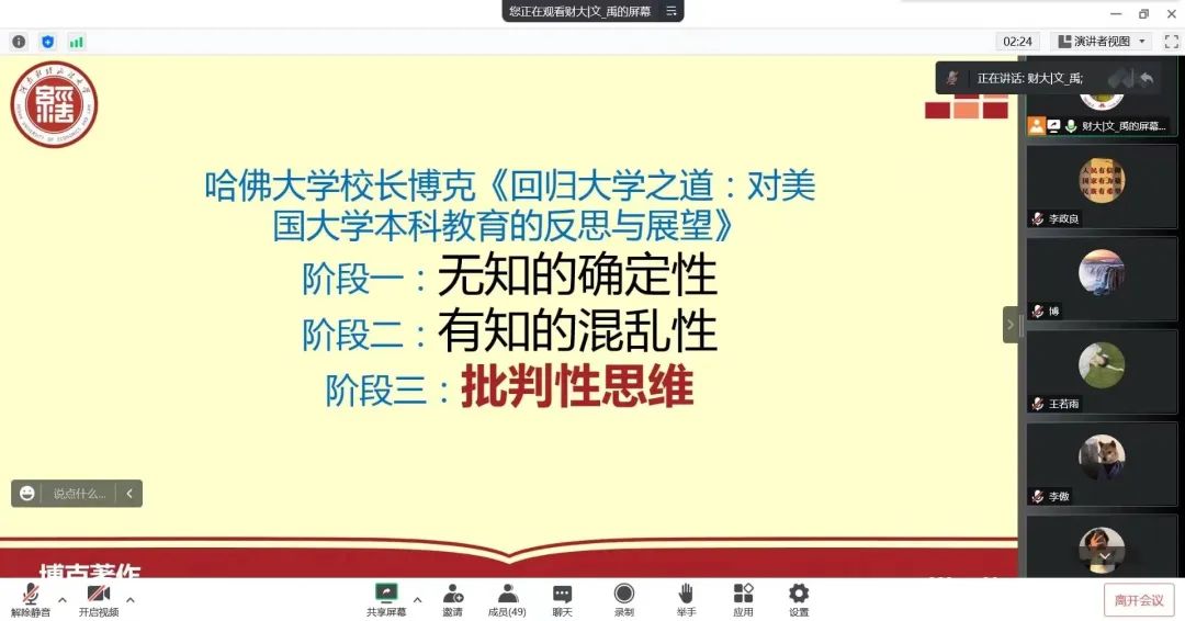 禹文钢老师从儒学出发,从学问从何而来、学问的根本是什么、学问与个人修养以及做学问的态度四个方面详尽细致地阐释了学习与学问的区别以及学问的真正含义。他强调,做学问要将学问之道建立在自己做人的根本之上,其根本在于培养“仁”中的“孝”,同学们不仅仅要读书学习渊博的知识,更要注重人生的建立,内心的修养,做一个敬爱父母、心性富有、贡献国家的高质量人才。